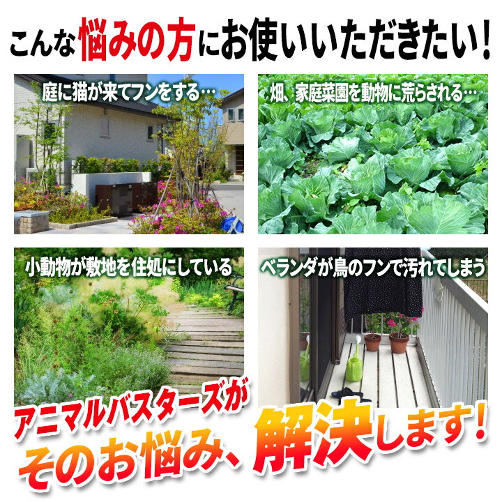 商品名 アニマルバスターズ 2台セット 鳥獣対策 商品情報 アニマルバスターズは、こんなお悩みを解決します! ・庭に猫が来てふんをする ・畑、家庭菜園を動物に荒らされる… ・小動物が敷地を住処にしている ・ベランダが鳥のフンで汚れてしまう ● 超音波と光で動物や鳥を寄せ付けない! 忌避剤のみだと雨風で、効果が激減してしまいます。