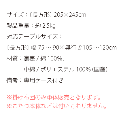サイズ:〔長方形〕 205×245cm 製品重量:約2.5kg 対応テーブルサイズ:〔長方形〕 幅75〜90×奥行き105〜120cm 材質:裏表/綿 100%、中綿/ポリエステル 100%(国産) 備考:専用ケース付き ※掛け布団のみ単体販売となります。